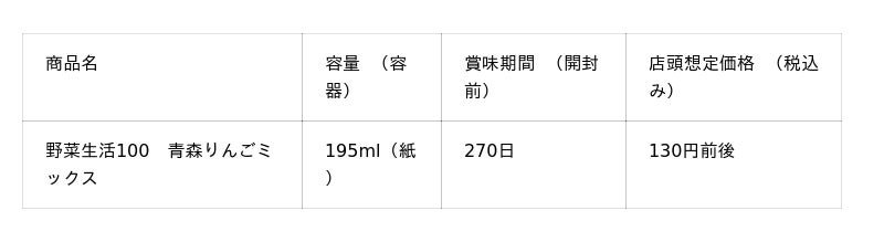 今回は、昼夜の寒暖差が大きく、甘くて美味しい果実が育つ青森県に着目しました。夏でも涼しく、暑さに弱いりんごの木の栽培にも適した土地です。このたび発売する「野菜生活100 青森りんごミックス」は、20種の野菜と3種の果実を使用し、甘くて美味しい青森県産りんごの味わいの野菜&果実100%ジュースです。朝食のおともや、リフレッシュしたいときにおすすめです。