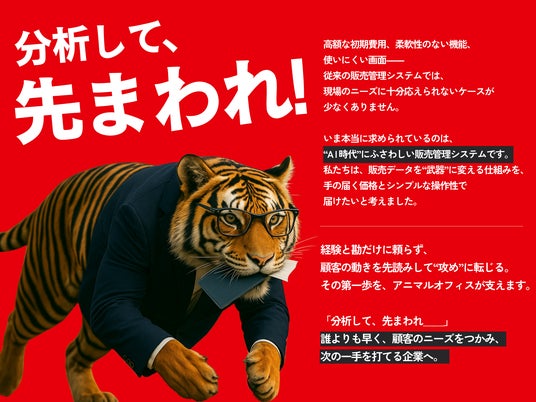 「アニマルオフィス」は、中小卸売業に最適化されたクラウド型販売管理・販売分析システムです。受注管理、請求書発行、粗利分析などの機能を標準搭載し、スマホやタブレットからも利用可能です。