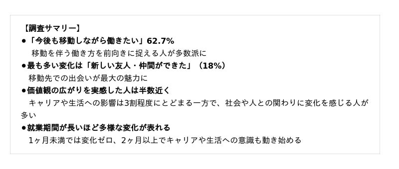 今回の調査は、こうした働き方を経験した方々に、その前後で感じた気づきや変化について伺い、「移動」という行為が個人の意識や行動に与える影響に目を向けることを目的としています。