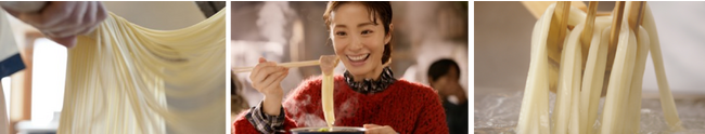 今回のTVCMは、冬らしいニットに身を包んだ上戸さんがわくわくした表情で、できたての『鴨ねぎうどん』を慎重に席まで運ぶシーンからスタート。ストーブがたかれたぽかぽかの店内で、ひと手間かけた打ち立てのうどんと、湯気が立ったあつあつの鴨肉を「これこれ!」と言いながら口へ運ぶ上戸さん。100%の国産小麦と水、塩でつくる打ち立て、茹でたての麺に、脂がのった鴨肉とこんがり焼き色の付いた白ねぎが盛り付けられ、うまみたっぷりのだしが注がれています。鴨肉とうどんをズルッと口にした上戸さんは、「鴨肉、やわらか~」と至福の表情でつぶやきます。