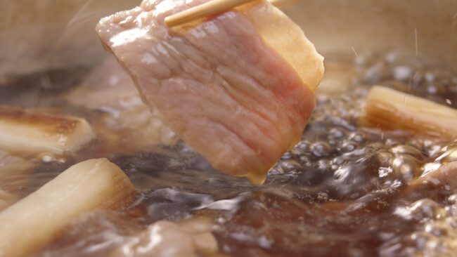 打ち立てのうどんと一緒にお召し上がりいただくために最適な厚みの鴨ロース肉は、ご注文をいただいてから特製の鴨だしに下味をつけた鴨ロース肉を火にかけ、手早く仕上げることで、パサつきがなくしっとり、やわらかで鴨肉の香り高く上品なうまみを堪能いただけます。焼き目をつけた白ねぎの香ばしさ、鴨の脂がにじみ輝くだしとあわせてぜひお楽しみください。