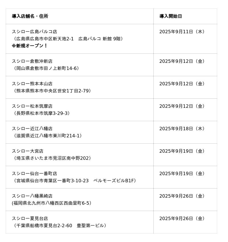 9月は広島県の繁華街に新規オープンする「広島パルコ店」をはじめ、その他のエリアでもリニューアルオープンに合わせ「デジロー」を導入いたします。9月末で日本国内の「デジロー」導入は124店舗となります。広島電鉄「八丁堀駅」から徒歩1分の「広島パルコ店」は、公共交通機関でのアクセスもよく、お買い物ついでにも気軽におすしをお楽しみいただけます。スシローではこれまでも様々な面でデジタルの力を活用してきましたが、今後も“うまいすし”に加えて、新たな店舗体験をご提供することで、いつ来ても楽しんでいただける店舗空間を作り続けたいと考えています。