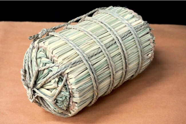 「藁」はそのまま使用せずに、強度を高めるため柔らかくしてから加工します。そのため各農家には、藁打ち用の藁打台・槌・杵などの道具が必ずありました。柔らかくした藁を編んで縄にし、さらにその縄を加工して米俵や鍋敷きなど様々な日用品が作られました。