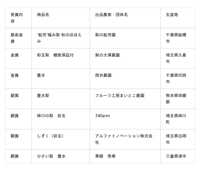 一般社団法人日本野菜ソムリエ協会(所在地:東京都中央区、代表理事:福井栄治)は、2025年9月3日(水)に、野菜ソムリエが選ぶ、もっともおいしい『梨』NO.1を決定する「第4回 全国梨選手権」(以下、本選手権)を開催しました。本選手権では全国各地の産地から届いた47品の梨を評価員である野菜ソムリエが産地や品種、生産者などの情報をすべて伏せて食味。そのおいしさを審査し、もっともおいしい「梨」を決定しました。審査の結果、「第4回 全国梨選手権」の最高金賞は千葉県船橋市 梨の船芳園が出品した「’船芳’極み梨 秋のほほえみ梨」に輝きました。