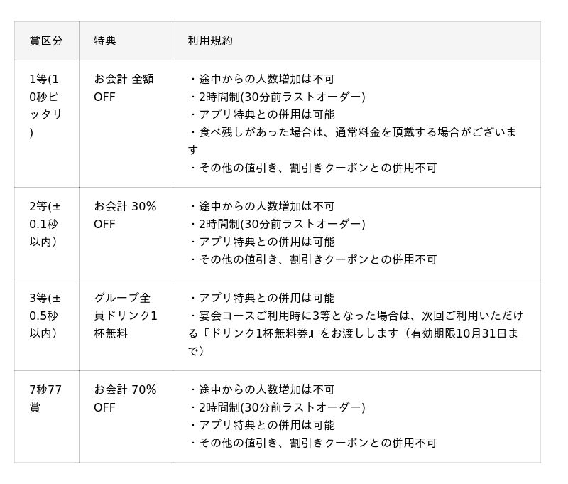株式会社一家ホールディングスの連結子会社である株式会社一家ダイニングプロジェクト(本社:千葉県市川市、代表取締役社長:武長 太郎 以下、当社)が運営する、九州博多の風物詩“中洲の屋台村”の雰囲気と名物料理を楽しめる劇場型酒場『屋台屋 博多劇場』全50店舗で、2025年9月8日(月)~9月14日(日)までの7日間、アプリ会員様限定の特別イベント「運試しストップウォッチチャレンジ」を開催いたします。期間中、会員様を含むグループの代表者1名様がストップウォッチチャレンジに挑戦でき、1等(10秒ぴったり)はお会計全額OFF、7秒77はお会計70%OFFなど、記録に応じてお得な特典をご用意しています。
