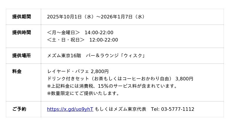 東京の躍動感や波長と共鳴し、上質な空間でクリエイティブな体験ができるモダンラグジュアリーホテル『メズム東京、オートグラフ コレクション』(港区海岸1-10-30/総支配人 生沼 久)は、16階バー&ラウンジ「ウィスク」にて、2025年10月1日(水)から2026年1月7日(水)までの期間限定で、芳醇な洋ナシと香り高いアールグレイを主役にした新作の「レイヤード・パフェ」をご提供します。