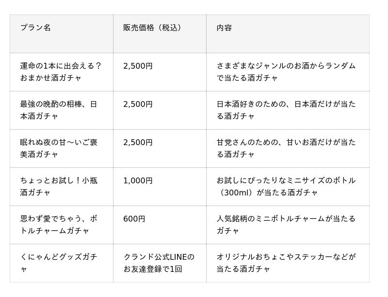 当たるお酒のラインアップには1本55,000円(税込)の30年熟成させた日本酒「天琥 -tenko- 30年」など、一般販売していないレアなお酒も入ります。他にもクランド公式LINEを友達登録すると回せる、「くにゃんどグッズガチャ」も登場します。