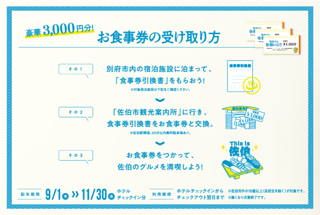 内容:別府に宿泊された方に、佐伯で使える3,000円分のお食事券をプレゼント