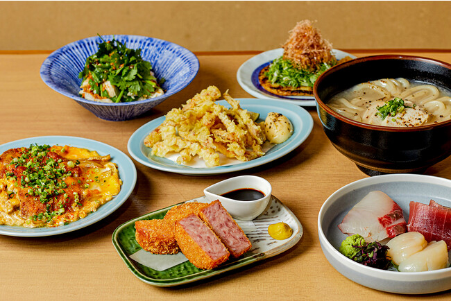“旨いツマミ”は、ピリッとした辛さにお酒がすすむ本店でも人気の自家製「柚子胡椒明太子」、漬け、ゴマ、タルタルなどお好みの味付けを選べ、単品~おまかせ3種盛り合わせまで味わえる「旬の海鮮」、厚切りでジューシーな雲仙ハムに衣をまぶしサクサクに揚げた「厚切り雲仙ハムカツ」、うどんの出汁が沁みわたるよう、薄く伸ばしたカツを卵でとじた「かつ丼のあたま」を始めとした約50種類のおつまみは胃袋を掴んで離しません。