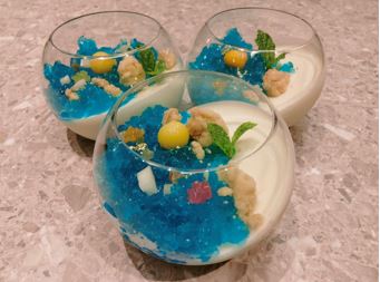 見た目から、奄美を感じられるように海の色を表現したデザートをみんなで考案しました!砂浜と海をどう表すか、味はどうなのかなど色々メンバーで案を出し合い、palpito sweetsさんに私たちのイメージ通りのスイーツにしていただきました!見た目も可愛くて、写真映えしておいしい!が詰まってます!ぜひたくさんの方に食べていただきたいです!!