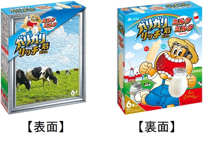 「ガリガリ君リッチミルクミルク」は、ミルクアイスの中に、ガリガリ食感の濃厚なミルクかき氷を入れたアイスキャンディーです。芸術の秋をテーマに、パッケージの表面は広大な牧場を油絵風のタッチで描き、銀色の額縁に飾った、まるで絵画展に来ているかのような気分になれるデザインに仕上げました。
