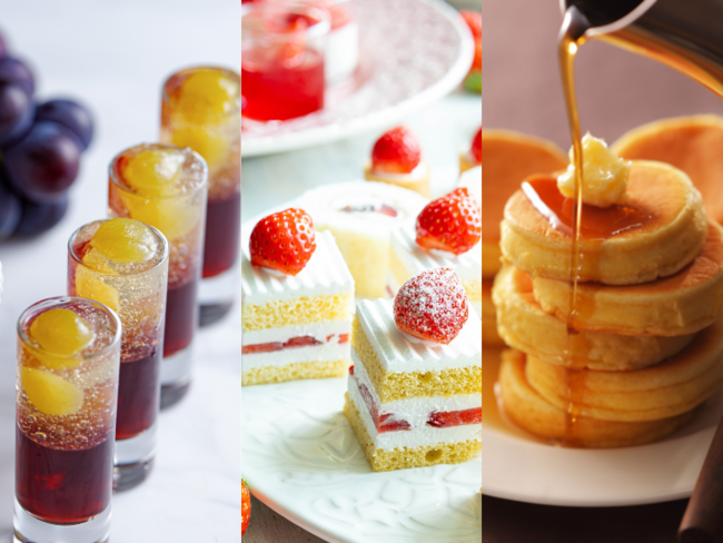 スイーツのラインナップは、ふわふわ食感がたまらないシグニチャーディッシュ「特製パンケーキ」や、甘さと酸味のバランスの良いいちごに、口当たりの軽いクリームで作り上げた「ストロベリーショートケーキ」など、人気スイーツがラインナップ。さらに、ミニタルト仕立てにしたモンブランや、ぶどうゼリー、マロンジェラートなど、秋ならではのスイーツも勢揃いし、全16種類のスイーツをお愉しみいただけます。