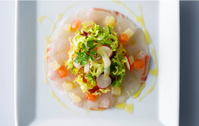 愛媛県産の真鯛を一度昆布締めにすることで旨みを引き出し、芳ばしい香りと、濃い味わいが特徴のくるみオイルを使用した特製ドレッシングで一味違うカルパッチョに仕上げました。