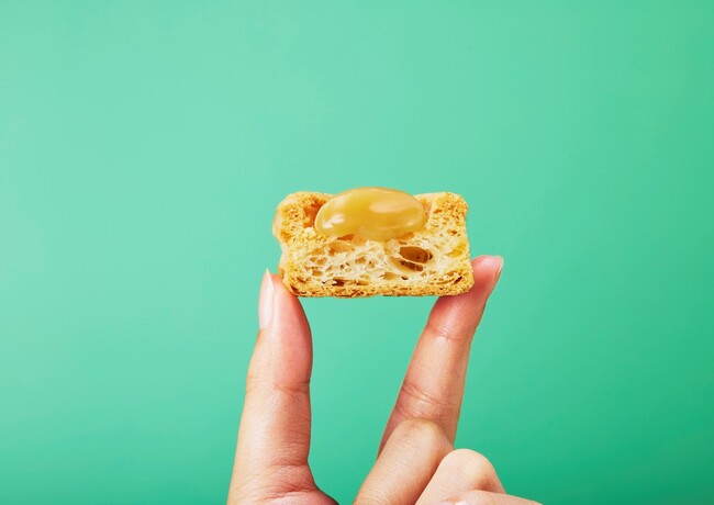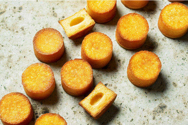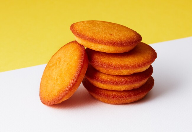 食感の異なる2つの生地ガレット・ブルトンヌとフィナンシェにミルクジャムを挟み三層仕立てで焼き上げました。表面のサクッとした歯ざわりと、ミルクジャムがふんわりと膨らみ、生地の真ん中にできる空洞が生み出す食感の軽さもお楽しみ頂けます。