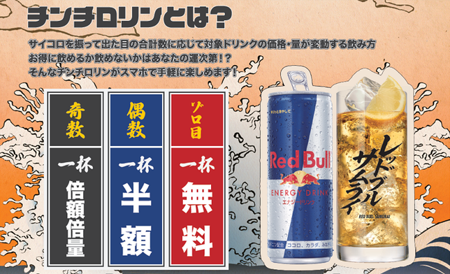 【レッドブルチンチロリンキャンペーンとは】専用サイトから2つのサイコロを振り、出た目の合計で嬉しい特典をゲット!出た目がぞろ目⇒1杯無料、出た目が偶数⇒1杯半額、出た目が奇数⇒倍額!倍量!