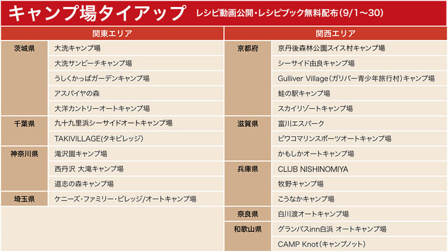 K-FOODを使ってどうやってキャンプ飯を作るの?という方にレシピを知ってもらうために、関東・関西全25ケ所で「レシピブック」を配布(2022年9月中配布予定)。さらに「キャプテンスタッグ」とのコラボステッカーも配布します。タイアップしているキャンプ場は以下よりチェックしてくださいね。