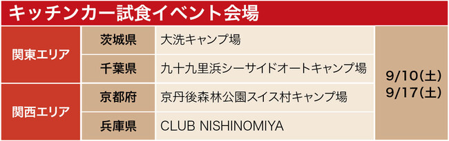関東・関西のタイアップするキャンプ場の中から、以下の場所でキッチンカーを出動して、その場で「K-FOOD×キャンプ飯」を楽しんでもらえる試食イベントを開催します。開催日は全て2022年9月10日(土)と、9月17日(土)の2日間。来場される方はぜひキッチンカーを探してみてくださいね。
