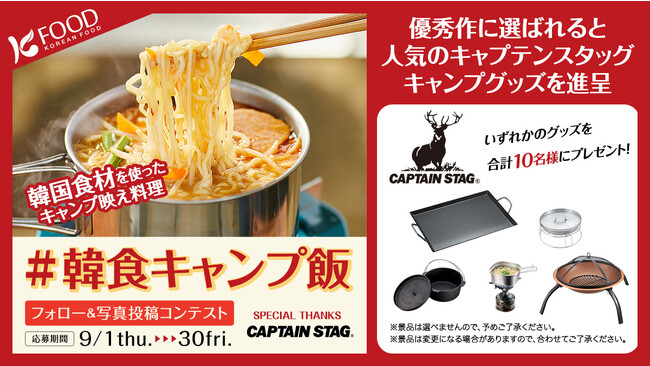 優秀作に選ばれた10名様には、キャプテンスタッグの素敵なアウトドアグッズを進呈!参加方法は、料理の写真や動画と「#韓食キャンプ飯」、「#kfood」を付けてInstagramに投稿するだけ。応募期間は2022年9月1日(木)~30日(金)まで。コンテストの詳細はInstagram公式アカウント「@atcenter_japan(https://www.instagram.com/atcenter_japan/)」でご確認ください。