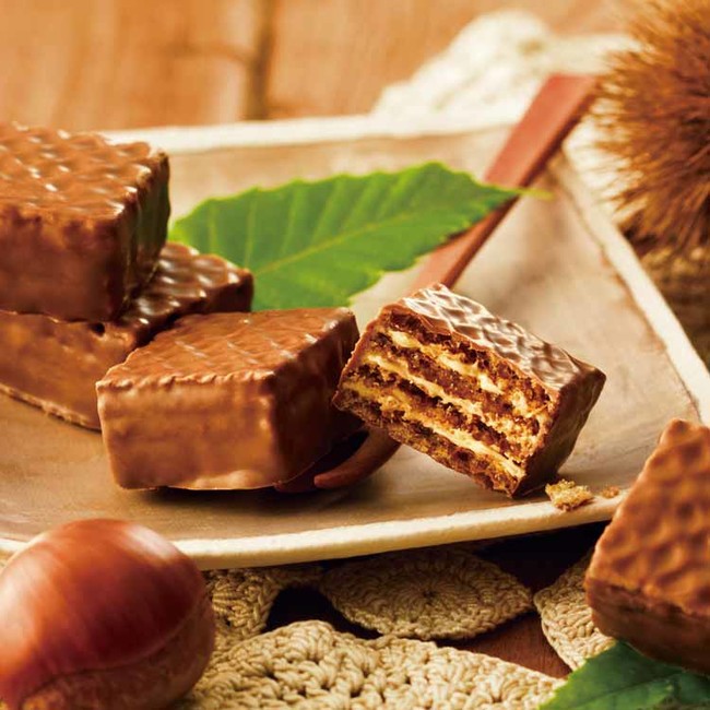 栗の風味が豊かに広がるリッチな味わいのモンブランクリームを、4層のウエハースでサンドし、やさしい甘さのチョコレートでコーティングしました。サクサクとした楽しい食感とまろやかな栗のおいしさが重なり合います。