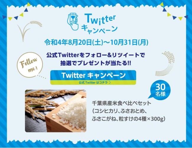 また、公式Twitterをフォロー&リツイートいただいたお客様に、抽選で30名様に千葉県産米食べ比べセットをプレゼントする企画も併開催します。