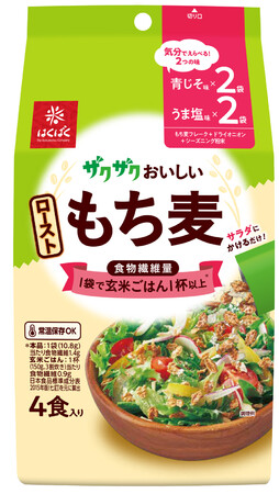 本商品はザクザクした食感が楽しいローストしたもち麦フレークに味を付け、クルトンのようにサラダに載せるだけでドレッシング×トッピングとして使用できます。約40%の人が食物繊維を摂るためにサラダを食べている一方で※1サラダから十分な食物繊維を摂るには大量に食べることが必要です。もち麦は腹持ちが良く、食物繊維が豊富なため、本商品をサラダに1袋かけるだけで簡単に玄米ごはん1杯以上※2の食物繊維を摂取でき、おなか×カラダのWで満足なサラダにできます。
