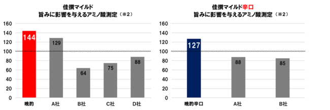 ※2:日本盛調べ(2022年3月)。複数あるアミノ酸のうち、旨みに影響を与えるアミノ酸5種類(アスパラギン酸・セリン・グルタミン酸・グリシン・アラニン)を測定。対象商品の平均値を100とする。