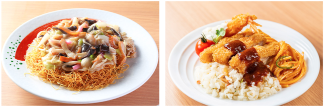 右:こちらもご当地メニューのひとつ「トルコライス」。チキンライスの上にトンカツやエビフライ、スパゲッティを盛り付けて、仕上げにデミグラスソースを掛けて召し上がれ。お子様はもちろん、大人のお子様ランチのような見た目に大人もワクワクする一品です。