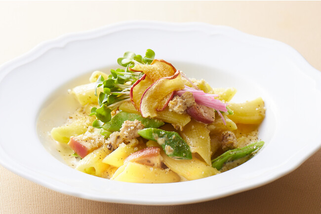 旬のきのことりんごを鶏ミンチとともに煮込みました。白みそと少しの生姜をアクセントに、桜かいわれの苦さ、モロッコインゲンの歯ごたえをペンネと合わせてご賞味ください。