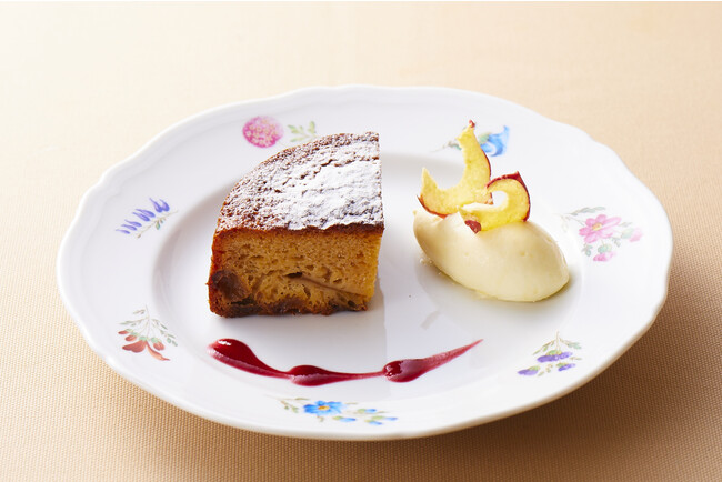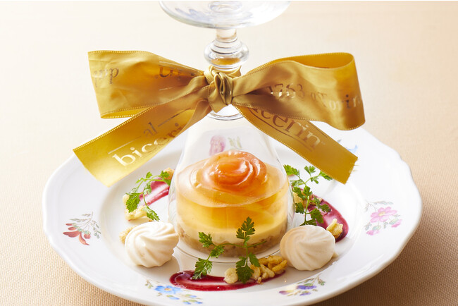 メニュー名はバラ色のりんごという意味です。バラ色に染めたりんごのコンポートを中心に置き、りんごのゼリーで包み込みました。レアチーズムースの酸味とともにお召し上がりください。