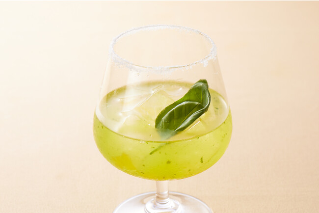 ジンをベースにりんごとバジルをブレンドしたカクテルです。グラスのふちに付けられた塩をアクセントに、りんごの甘味とバジルの豊かな香りをお楽しみください。