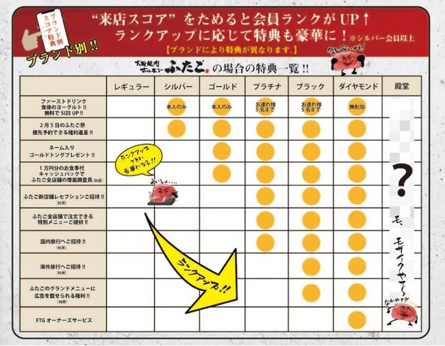 各ブランドを1回ご利用ごとに来店スコアが貯まり、貯まったスコアに応じて会員ランクがアップします。会員ランクがアップするごとに特典がより豪華に!会員ランクは全部で7段階、マイネーム入りゴールドトングプレゼントや抽選で国内旅行や海外旅行にご招待します。