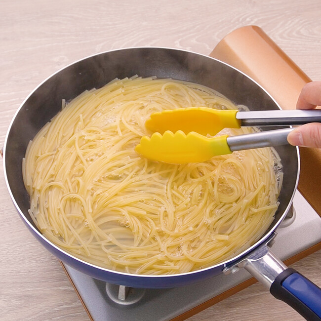 フライパンを使って、スパゲティを蒸す方法をご紹介します!ゆでるよりも少ない水で作れるので、お湯をわかす手間が省けます♪水がたくさん使えない時にも便利な方法です!蒸したパスタはフライパンの中でそのままお好みのパスタソースをからめてお召し上がりください!