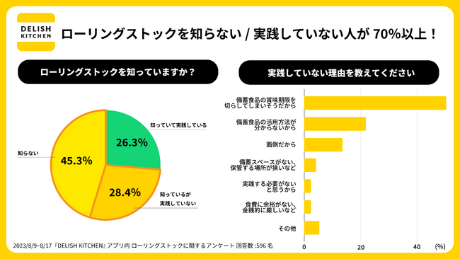 しかし、『DELISH KITCHEN』がローリングストックに関するユーザーアンケートを実施したところ、ローリングストックを実践している人は26.3%にとどまり、ローリングストックを知らない人が45.3%と最も多く、知っているが実践していない人が28.4%という結果でした。