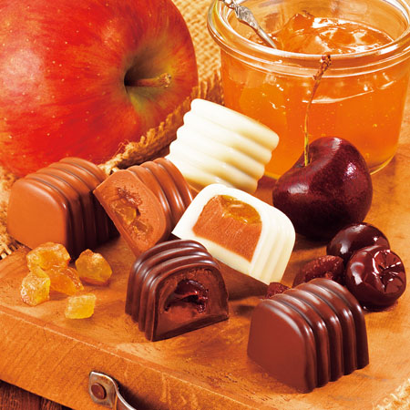 フルーツの果肉やジャムを、それぞれ相性の良いガナッシュとともに3種類のチョコレートに閉じ込めました。香り立つ洋酒と、ジャムや果肉の食感とのハーモニーをお楽しみください。
