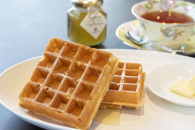 焼きたてワッフルに「フランス政府AOP認証バター」を 添えて。濃厚な甘みを感じる「心斎橋のはちみつ」とともにお召しあがりください。