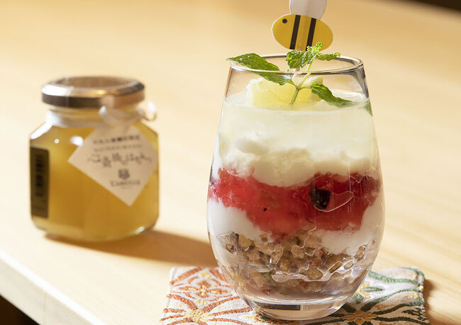 華やかな甘さが特徴的な「心斎橋のはちみつ」を随所 にちりばめ、丸く愛らしいグラスデザートに。ここだけの優しい味わいとひとときを。