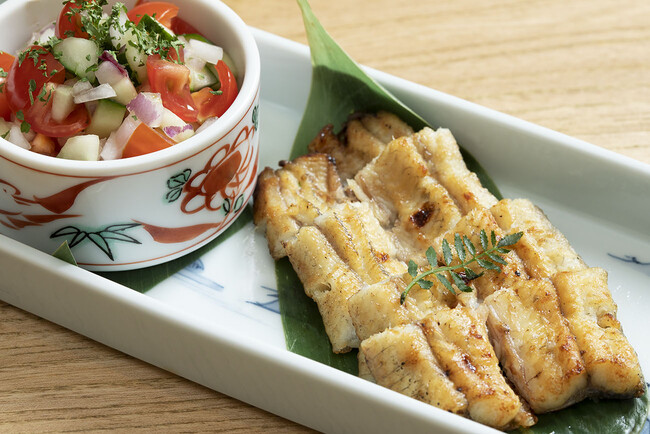 うなぎの白焼きに「心斎橋のはちみつ」を使ったサルサソースを添えてご提供。はちみつの濃厚な甘みにサルサのピリッとした辛みが調和し、暑さの残るこの時期にぴったりです。