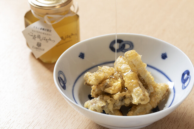 サクサクに揚げたごぼうを、「心斎橋のはちみつ」と塩で甘じょっぱく仕上げたアニバーサリー限定メニュー。揚げたての天ぷらにはちみつをまとわせてどうぞ。