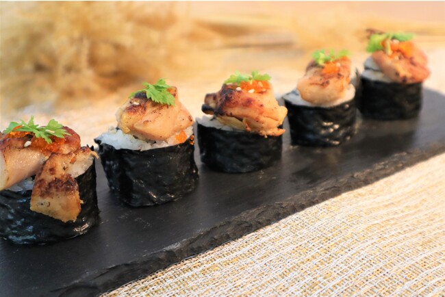 みょうがや大葉の巻きずしの上に「心斎橋のはちみつ」を使用して照り焼きにされたチキンがドンと乗っています。薬味とチキンが絶妙にマッチ。とびこのプチプチ感もアクセントです。