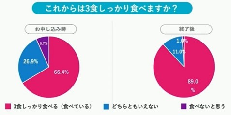 一般視聴者へ「これからは3食しっかり食べようと思うか」とのアンケートを行った結果、事前の回答では【(3食しっかり)食べている】が66.4%だったのに対し、今回のフォーラム参加後では【これからはしっかり食べようと思う(これまでも食べている)】と回答した人が89%と約23ポイントUPとなりました。さらに、フォーラムに参加して栄養の摂り方への意識は変わりましたか?という問いに対し、【変わった】と回答した人が74%に上りました。フォーラムへの参加が意識改善に寄与したことがうかがえます。