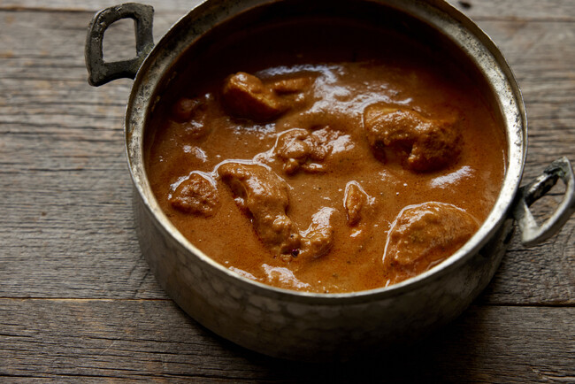 北インド発祥の「バターチキン」は、乳製品を使ったマイルドな味わいです。そこに、現地ではお惣菜として食べられ、乳製品とも相性のよいビーツを掛け合わせました。また、甘くほろ苦い風味が特徴のカスリメティをはじめ、数種類のスパイスを使用。ホールも全て砕き、バターと炒めて加えています。ビーツの甘みと美しい赤、スパイスが織りなす複雑な香りが漂う、少し大人なバターチキンに仕上がります。