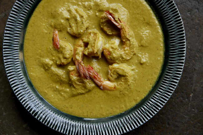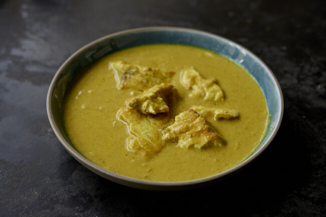 南インドのターメリックをきかせた「フィッシュカレー」に、爽快なレモンの果実感、カシューナッツなどのエッセンスを加えた黄色のカレーです。レモンの風味に合わせてスパイスは、ターメリック、フェンネル、カルダモン 、コリアンダー、ブラックペッパーを使用。レモンは皮まで加え、青唐辛子とともに奥行きのある後味に。