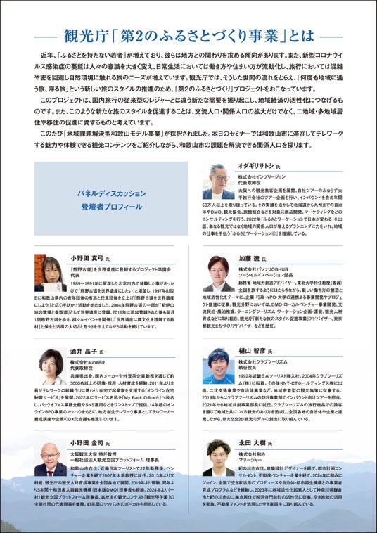 内容:基調講演では、大阪観光大学の山本健慈氏が「地方創生とテレワーク」をテーマに登壇。その後、株式会社パソナJOBHUBの加藤遼氏、株式会社インプリージョンのオダギリサトシ氏、株式会社aubeBizの酒井晶子氏、株式会社クラブツーリズムの樋山智彦氏、そして「熊野古道」を世界遺産に登録するプロジェクト準備会の小野田真弓氏ら著名なゲストが登壇し、和歌山の魅力を語るパネルディスカッションを行います。
