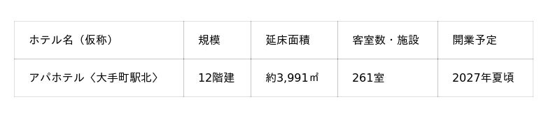 アパホテル〈大手町駅北〉は、千代田区内神田1-15-8他9筆(地番)、敷地面積:669.39平方メートル (公簿面積)、東京メトロ各線「大手町駅」より徒歩8分、東京メトロ千代田線「新御茶ノ水駅」より徒歩4分、「小川町駅」、「淡路町駅」、「神田駅」、「竹橋駅」の6駅が徒歩圏内に位置することから、ビジネス・レジャーとも需要が多く見込める交通利便性の高い立地に位置する。客室数は261室、2027年春頃の開業を目指す。