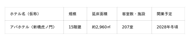 アパホテル〈新橋虎ノ門〉は、港区西新橋1-17-1他3筆(地番)、敷地面積:464.87平方メートル (公簿面積)、都営三田線「内幸町駅」より徒歩2分、東京メトロ銀座線「虎ノ門駅」、JR各線「新橋駅」より徒歩4分。日比谷通りも近接する至便な立地に位置する。虎ノ門・新橋駅エリアの既存アパホテルの稼働も好調であることから、更なる需要獲得を目指し、今回の取得に至った。客室数は207室、2028年冬頃の開業を目指す。