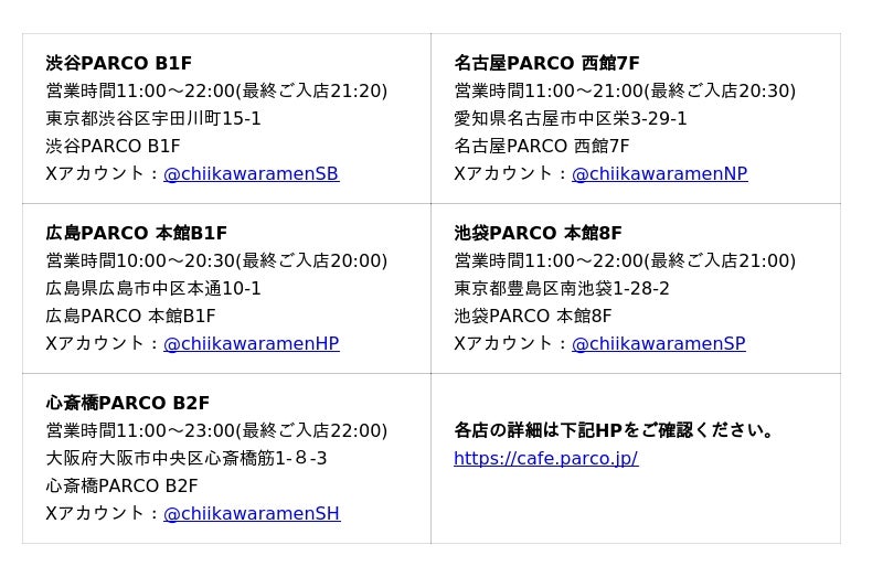 株式会社パルコは、イラストレーター ナガノによる人気作品『ちいかわ』に登場する話題のラーメン屋さんをイメージした「ちいかわラーメン 豚」を全国4店舗開催中の他、9月19日(金)には渋谷PARCO店もオープン予定です。この全店にて10月3日(金)より、期間限定メニュー“ラーメン豚 豚骨”の提供を開始いたします。