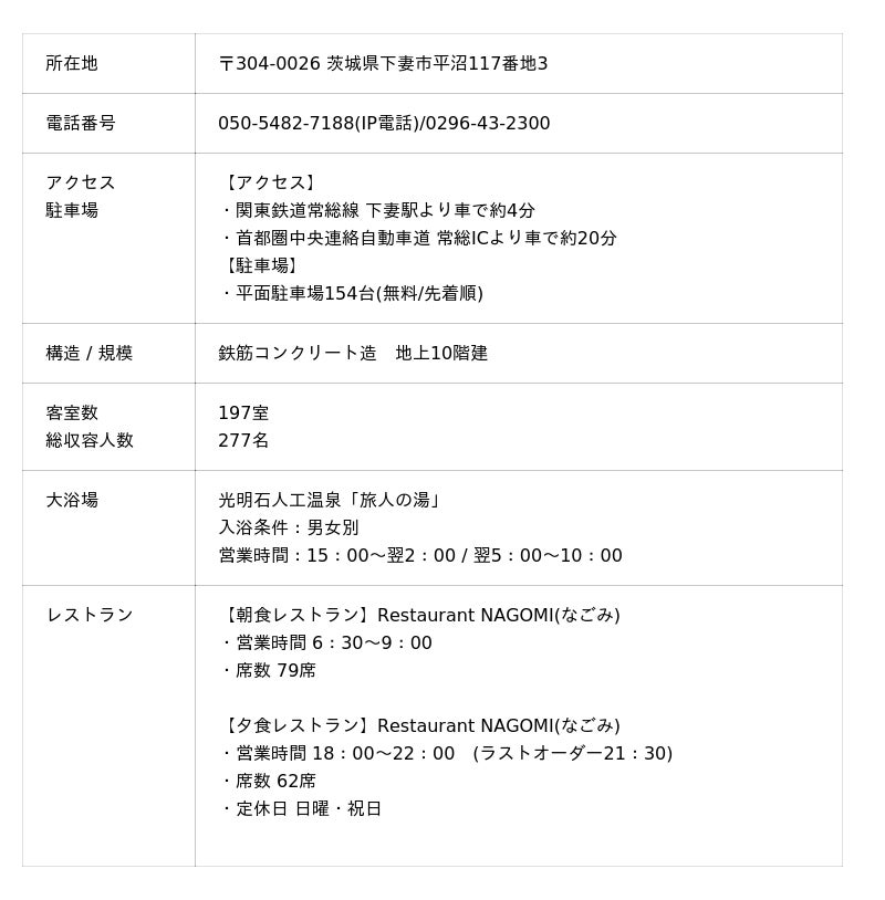 関東鉄道常総線 下妻駅から車で約4分、首都圏中央連絡自動車道 常総ICから車で約20分に位置し、9つの工業団地に囲まれており、ビジネスの拠点として注目を集めております。また、関東最古の八幡宮として知られる「大宝八幡宮」へは車で4分と、観光にも大変便利な立地です。車で20分圏内には筑波サーキットもあり、観光・レジャーの拠点としてもご利用いただけます。自慢のバイキング朝食や光明石人工温泉を備え、快適なご滞在をサポートいたします。