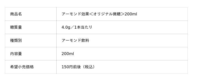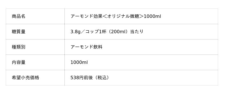 こうした背景を踏まえ、当社はお客様の多様な甘さのニーズに応え、アーモンドミルクの香ばしさと、ほどよい甘さを両立した「アーモンド効果<オリジナル微糖>」を新たに開発しました。