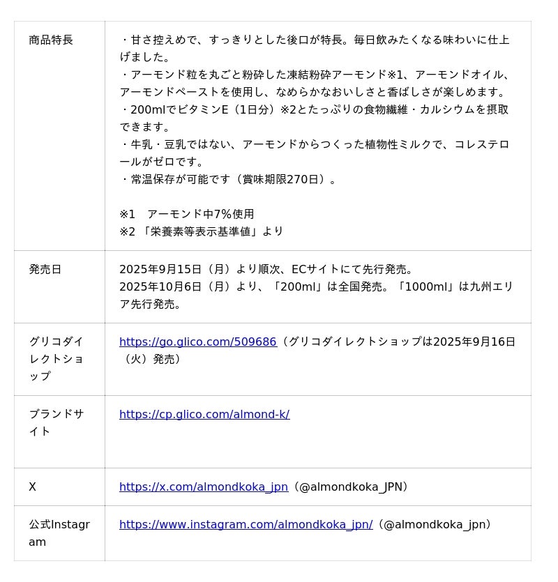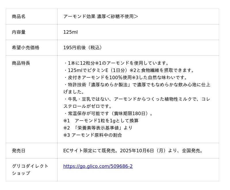 「アーモンド効果」ブランド史上最高のアーモンド濃度を実現した「アーモンド効果 濃厚<砂糖不使用>」は、江崎グリコの特許技術である「濃厚なめらか製法」により、高濃度でありながらもなめらかな飲み心地を実現し、好評をいただいています。本商品は昨年よりECサイト及び通販宅配ルート限定で販売していましたが、2025年10月6日(月)より全国のスーパー、コンビニなどの実店舗にて販売を開始します。
