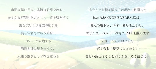 Sake de Bordeaux s.a.r.l.清酒文化の地平を世界へ。私たちは日本酒への深い愛を胸に、フランスの地でsakeを醸し、その文化を世界へと広めます。自然と人の智恵の結晶である清酒は、四季や人生の節目を彩ってきました。その奥深さに敬意を表し、愛する日本の酒に比肩する一杯を目指して、酒文化の新たな地平を拓いていきます。
